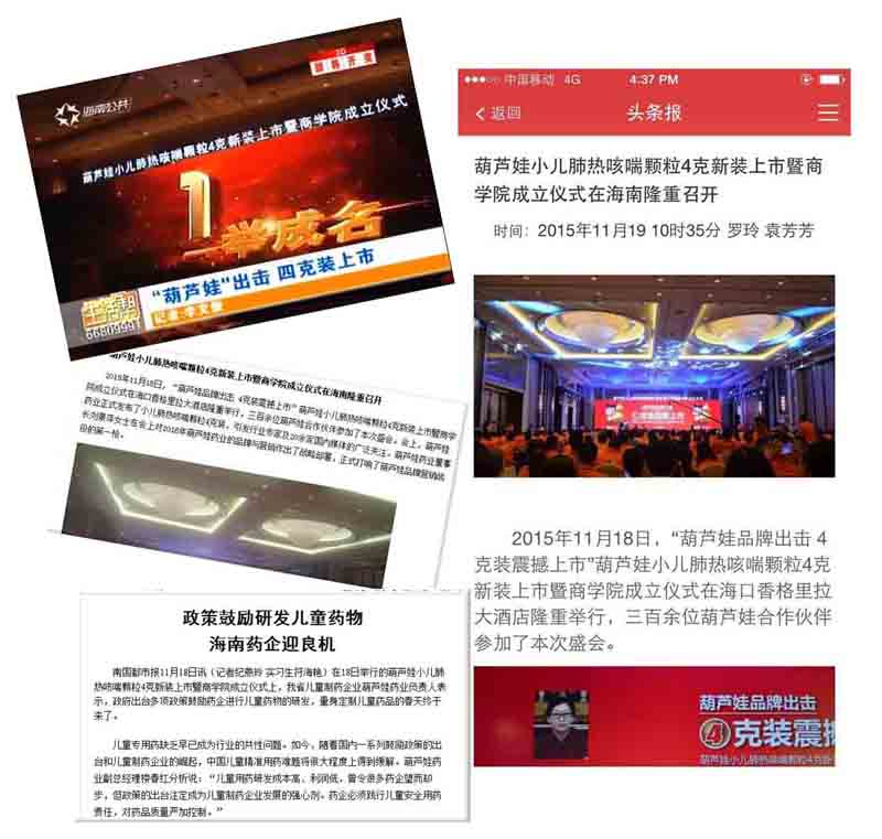 2015年11月18日,“千赢国际品牌出击 4克装震撼上市”千赢国际小儿肺热咳喘颗粒4克新装上市暨商学院成立仪式在海口香格里拉大酒店隆重举行。会上,千赢国际药业整合营销资源,品牌全面发力,并正式发布小儿肺热咳喘颗粒4克装。浙江电视台、海南电视台、海口电视台、海南日报、海口晚报、安徽晚报、新华网、光明网、央广网、网易、搜狐、凤凰网、中华网、中国经济网、中国药店杂志等30余家国内著名媒体对千赢国际品牌出击盛会进行了集中报道。